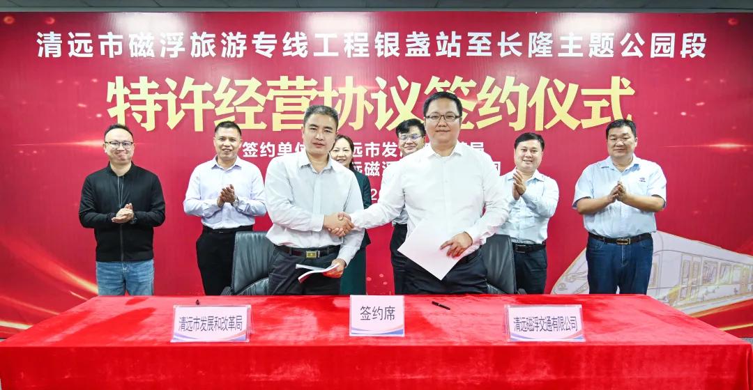 2020年11月25日,清远市发展和改革局党组书记、局长廖家杰,清远磁浮交通有限公司党工委书记、董事长周飞在清远市分别代表双方正式签订《清远市磁浮旅游专线工程银盏站至长隆主题公园段特许经营协议》。