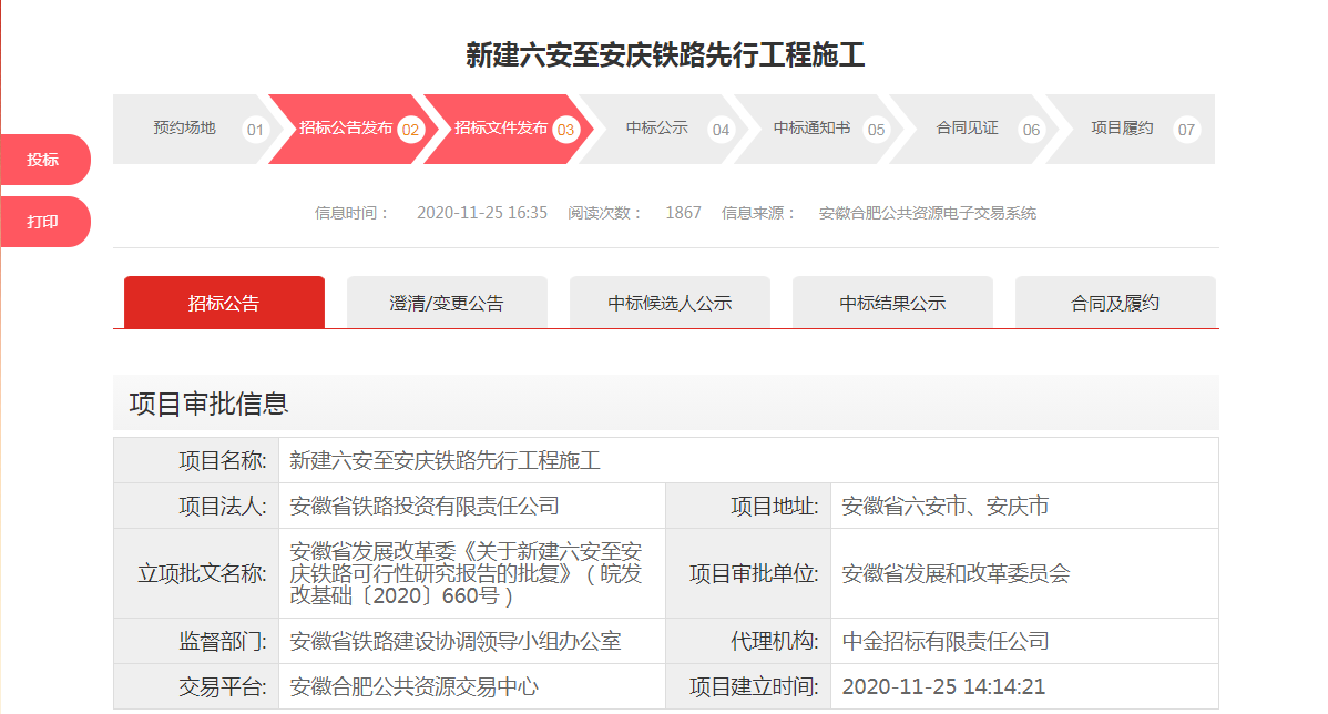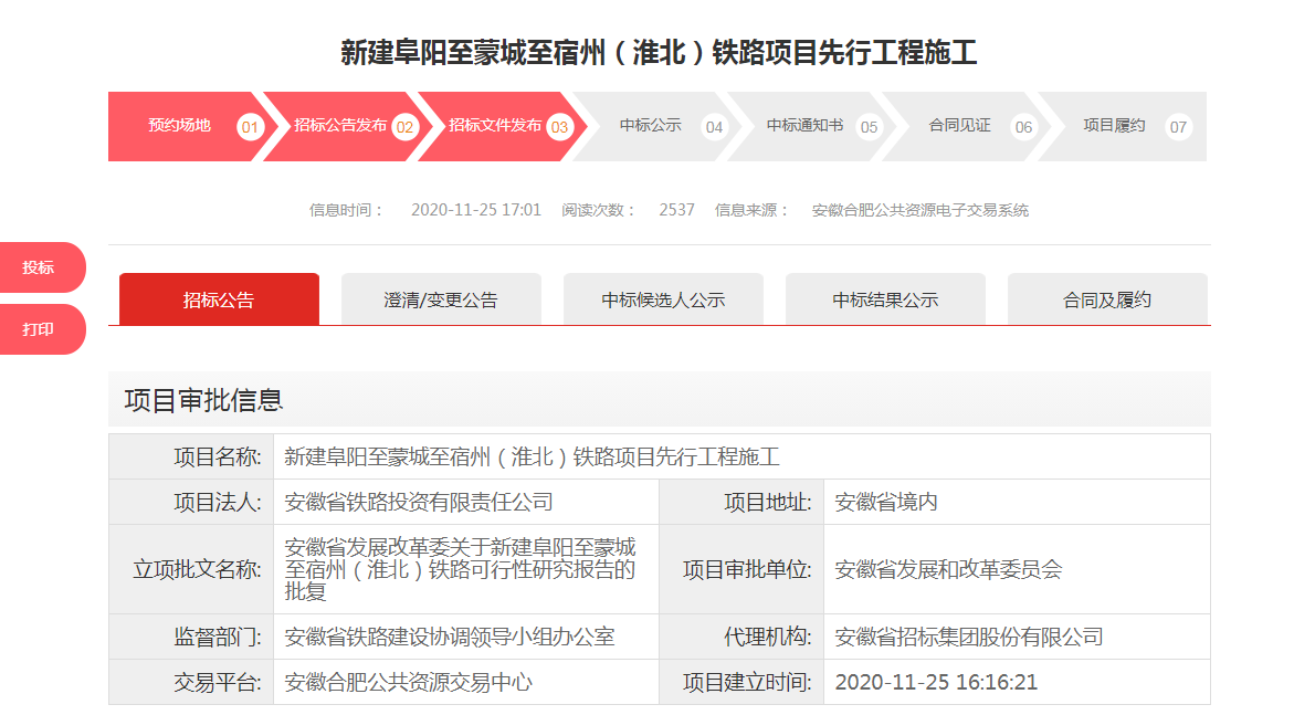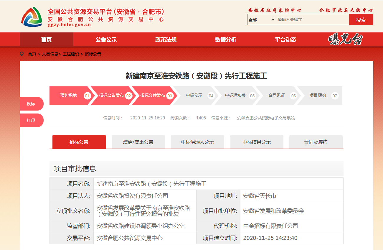中国e车网讯:11月25日,安徽合肥公共资源交易中心相继发布了《新建南京至淮安铁路(安徽段)先行工程施工招标公告》、《新建六安至安庆铁路先行工程施工招标公告》以及《新建阜阳至蒙城至宿州(淮北)铁路项目先行工程施工招标公告》。标志着这三条城际铁路先期工程将于12月底正式开工。
