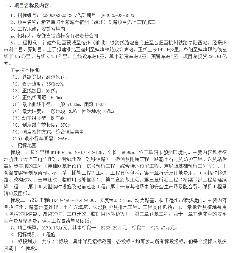 先行工程:标段一:起讫里程DK140+156.3~DK142+125,全长1.969km,位于阜阳市颍州区境内(引入阜阳西站工程)。主要内容包括征地拆迁、桥涵及附属工程、路基土石方及防护工程以及站后需同步实施的工程。