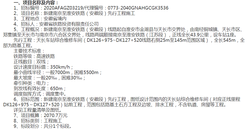 先行工程:天长车站综合维修车间(DK126+975~DK127+520线路右侧25m至145m范围区域),全长545m,全部为路基工程。