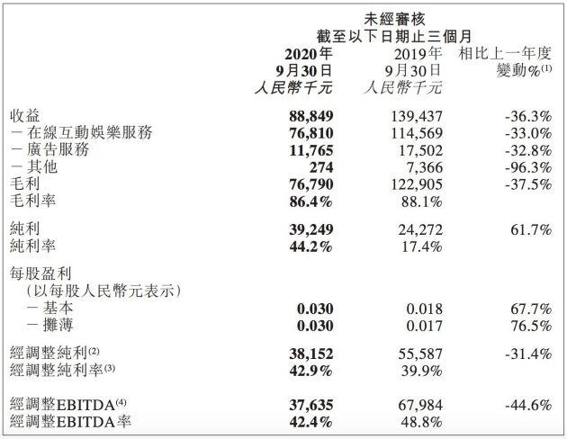 截至2020年9月30日止三个月,天鸽在线互动娱乐服务的季度付费用户人数约为27.7万人,较截至2020年6月30日止三个月减少了约31.9%,及较截至2019年9月30日止三个月减少约44.9%。有关减