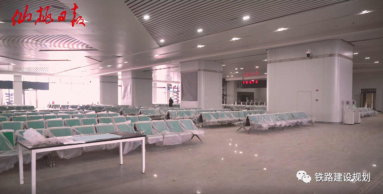 站房内部装修接近尾声。进站大厅安检口、检票口、电子显示屏等设备全部完成安装调试,候车厅配备1500个座椅供旅客使用,VIP候车室、母婴室、茶水室、卫生间等一应俱全。右侧售票厅内部装修也在加班加点进行。