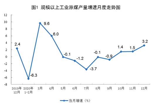 原煤生产有所加快。12月份,生产原煤3.5亿吨,同比增长3.2%,增速比上月加快1.7个百分点;日产1135万吨,环比减少23万吨。2020年,生产原煤38.4亿吨,比上年增长0.9%。