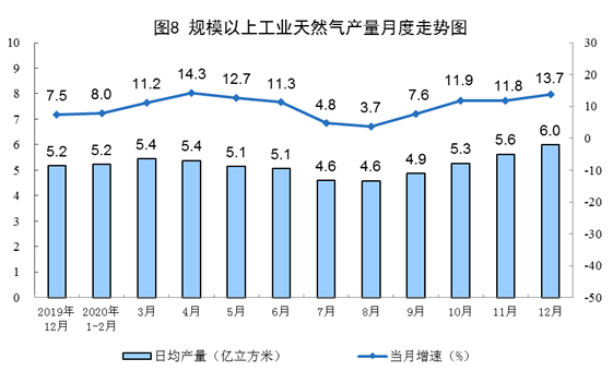12月份,规模以上工业原煤、天然气、电力生产加快,原油生产略有放缓。2020年,规模以上工业原煤产量略有增加,原油生产增速加快,天然气保持快速增长,电力生产稳定增长。
