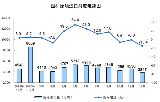 天然气进口由降转增。12月份,进口天然气1123万吨,同比增长18.0%,上月为下降2.4%。2020年,进口天然气1.02亿吨,比上年增长5.3%。