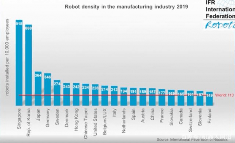 迄今为止,机器人密度最高的国家仍然是新加坡,2019年,每1万名员工配有918台机器人。主要客户是电子业(75%)。
